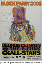 Syracuse, NY (ENet News) - The Funk hit the fans as George Clinton and the P-Funk All Stars hit the stage for the Syracuse University Union block party Sunday at the Carrier Dome. Friday in Buffalo, Sunday in Syracuse, and Wednesday in New Orleans is how the schedule goes for the funk college tour.